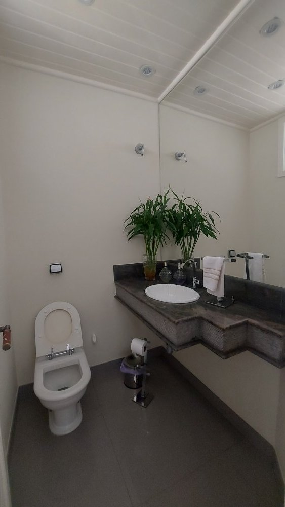 Lavabo com bancada decorativa em granito, acabamento das paredes e piso em porcelanato e iluminação com luz dicroica de led.