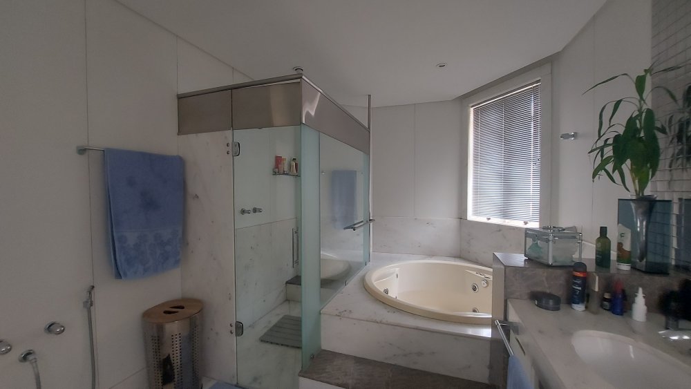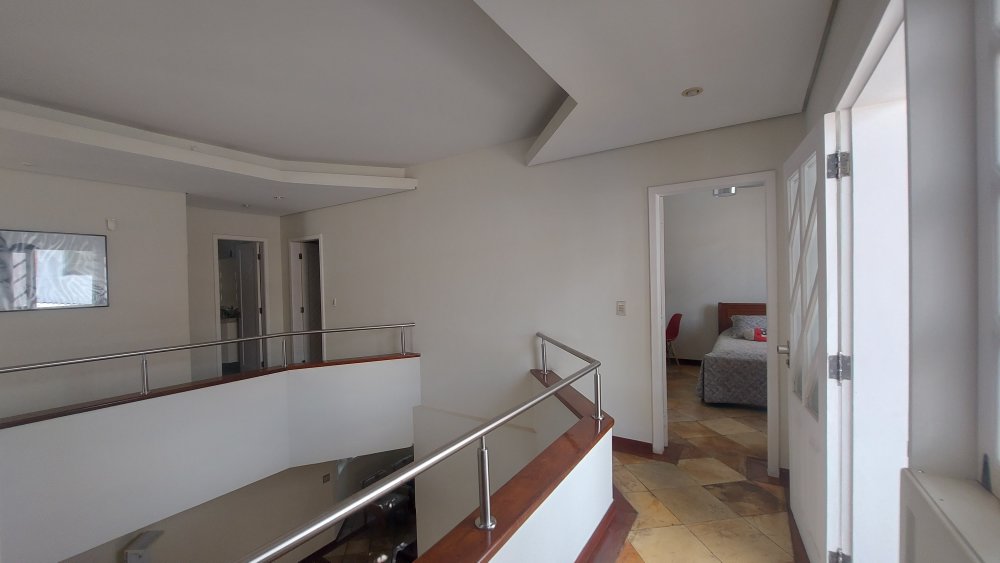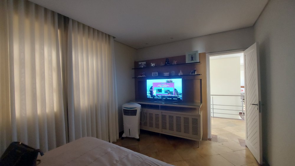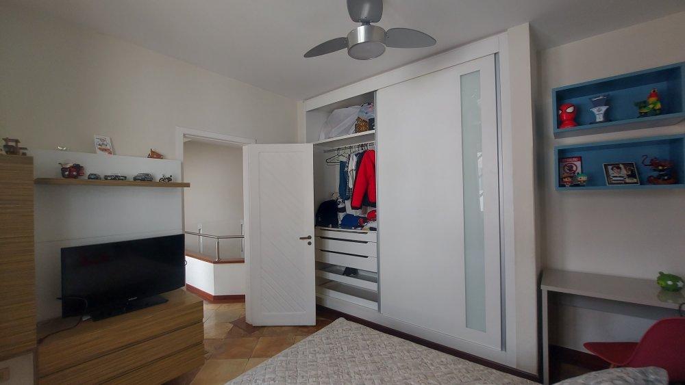 Andar superior com hall decorado com rebaixamento em gesso, iluminação especial com luz dicroica em led, guarda corpo em inox e amplas varandas com vistas para frente e para os fundos da casa, 03 quartos amplos com armários e painéis, sendo o do casal com uma ampla suítes master com hidro massagem, box blindex , bancada em mármore com 02 bojos e closet, banho social com armário, box blindex e bancada em granito, armário para roupas de cama e de banho.