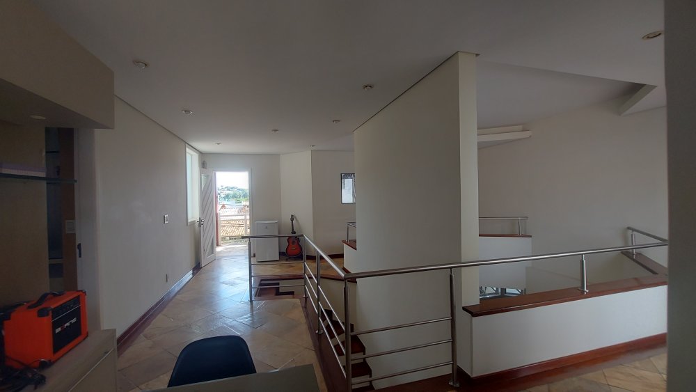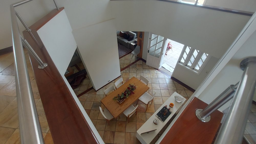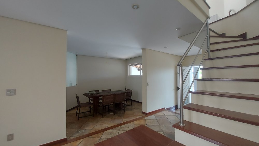 O primeiro piso conta com sala de estar maravilhosa para 3 ambientes com pé direito duplo, estilizada com pisos em pedra decorativa e madeira, escadas de acesso ao segundo piso em madeira.