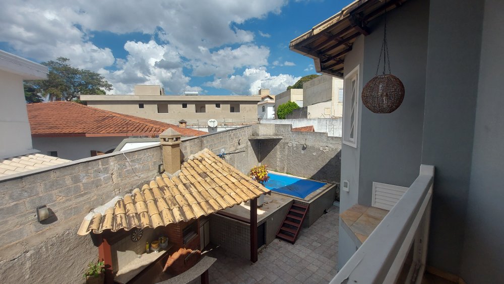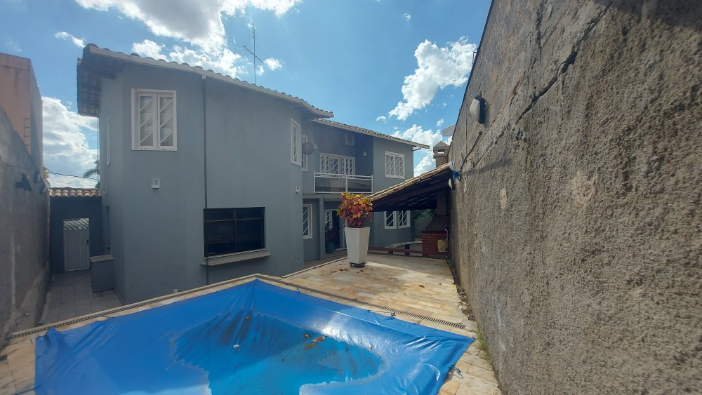 Área livre nos fundos da casa com área de lazer com churrasqueira e piscina.