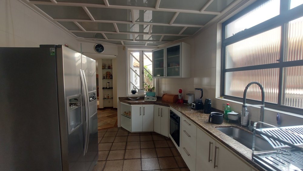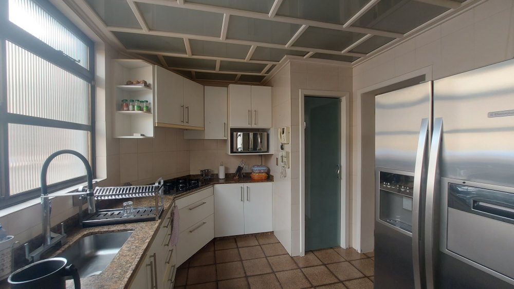 Cozinha com conceito único muito espaçosa e arejada, bem iluminada, muito requintada; toda planejada com armários, imensa bancada em granito com fogão cook top; pia em inox com torneira flexível e água com aquecimento; forno embutido; lindo teto rebaixado em vidro com detalhes em madeira branca.