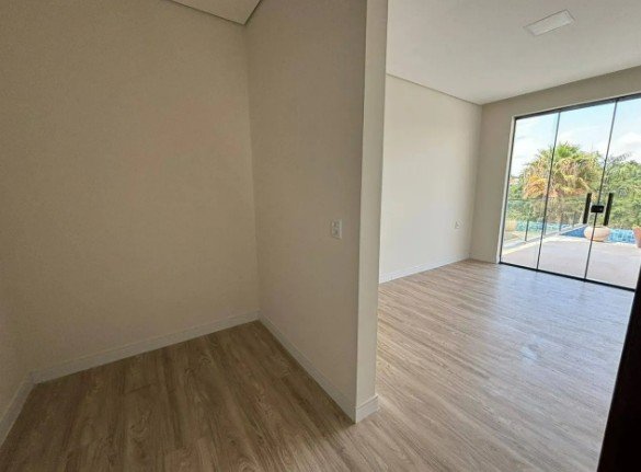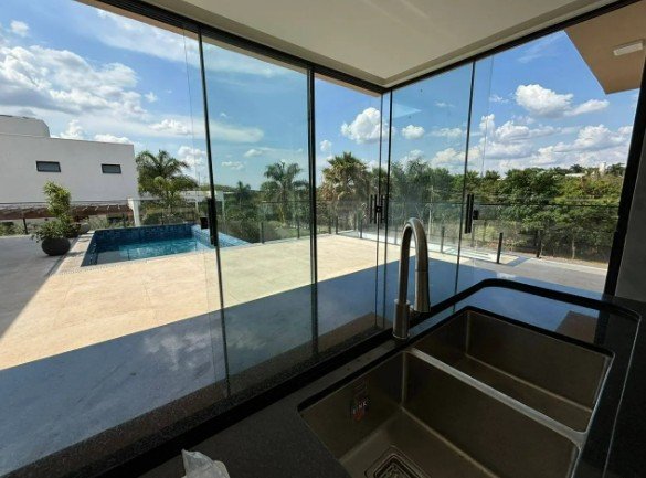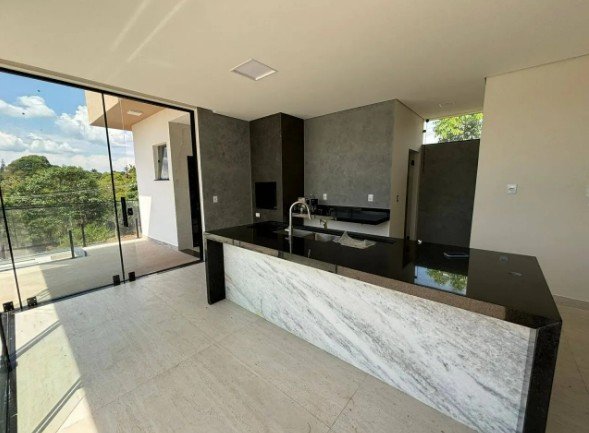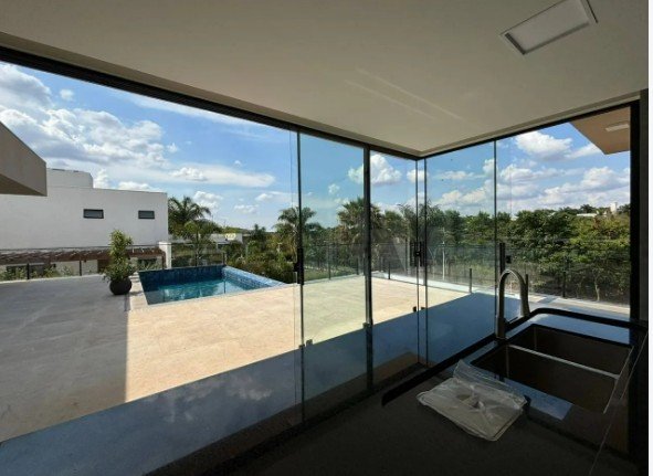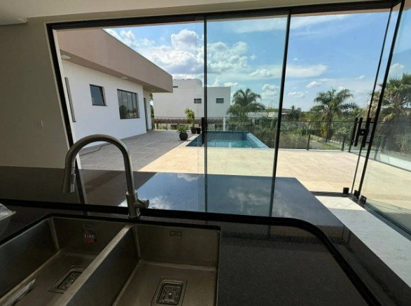 Casa composta por sala conjugada com ampla cozinha com bancadas em granito e pia em inox com acesso a área gourmet completa e a área de lazer com piscina com borda infinita, sauna, banheiro social e lavanderia.