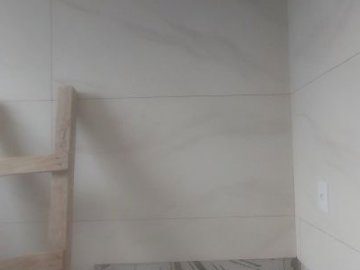 - Banheiro social com revestimento até o teto e bancada em granito