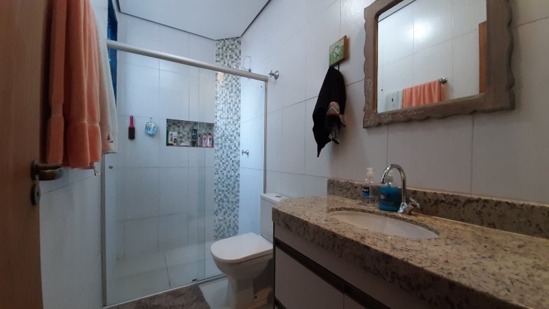 Banheiro social com bancada em granito, box em blindex e armário planejado;
